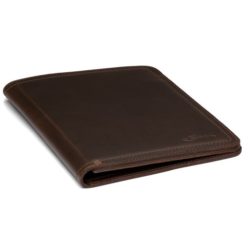 Dimensions: 13.63" x 10.25"; 2 large paper divider flaps; 1 calculator pocket; 1 business/credit card pocket; Lined with pigskin, which is the 2nd toughest leather. Kangaroo is the toughest. 100% Full Grain leather, not the weaker top grain, genuine or bonded leathers. The leather is smooth, but you won't be rubbing this one on your cheek. I laugh when I hear people talk about how soft and buttery their leather was when they first received it. Basically, the tannery weakened the leather by tumbling it for several extra hours to tear the fibers apart (softening it up). They take years of life out of the leather when they do that. The same concept is done with a meat cleaver on a cut of meat to tenderize it. Firm feel because of a thin sheet of polypropylene sewn into middle of each side. Neoprene layer on each side for comfort and padding. One solid outer piece of leather so it won't fall apart at the seams. Most things come apart at the seams and so the fewer the seams the longer it'll last. Of each hide, about 20% ends up on the floor in the form of small scraps. Some manufacturers quilt together notepad holders out of a dozen scrap pieces. We don't. We use large solid pieces on every design because that's quality.